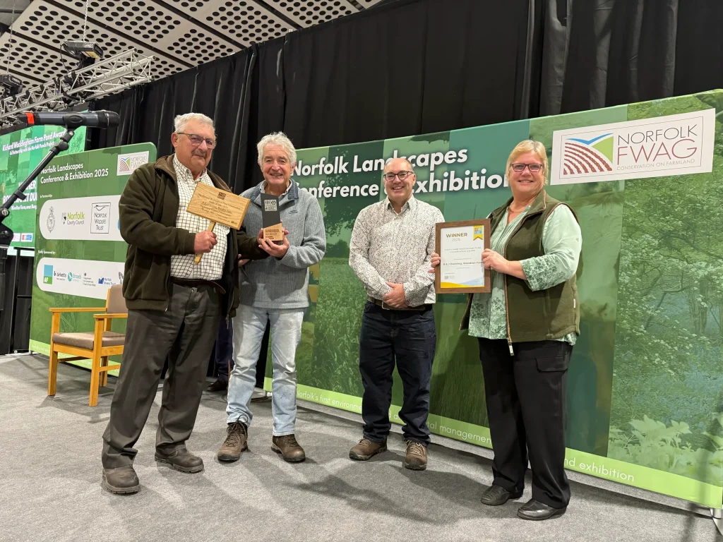We also extend our congratulations to Gavin and Jane Lane of Manor Farm, Tittleshall, who received the Highly Commended Richard Waddingham Award. Their recent pond restorations and wider conservation work demonstrate a strong, forward-looking approach to enhancing farmland biodiversity in Norfolk.
